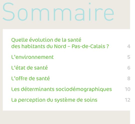 L'observatoire régional de la santé publie une nouvelle étude mesurant l'évolution de la santé des habitants du Nord-Pas-de-Calais. La santé de ces derniers est étudiée à travers différents prismes : l'environnement, l'état de santé, , l'offre de santé,...