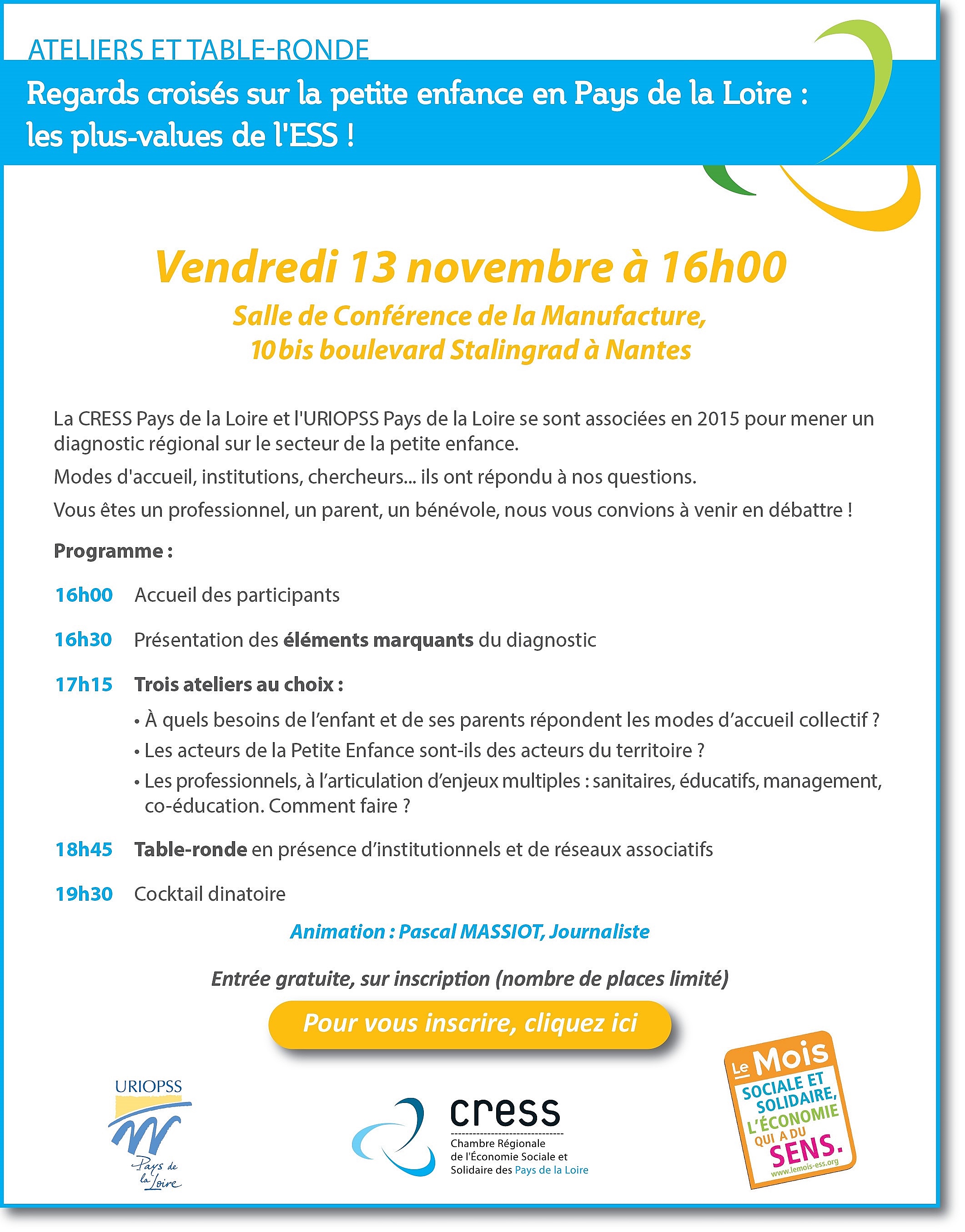 C'est avec plaisir que nous vous convions à la restitution de notre « État des lieux régional Petite enfance » en Pays de la Loire de l’URIOPSS en partenariat avec la CRESS. Ce projet a été mené entre juillet 2014 et octobre 2015. Autour de la restitution de nos travaux (recherches bibliographiques, près de 40 entretiens, de cartographies régionales de l’ESS dans la petite enfance…), nous organisons ce temps d’échanges et de convivialité. L’entrée est libre sur inscription en cliquant sur ce lien: